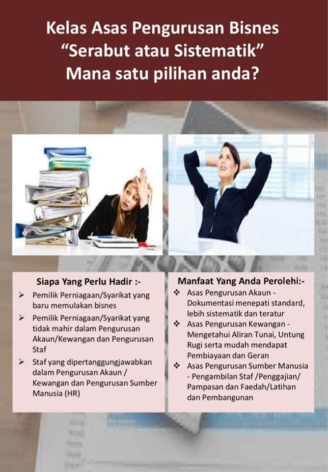 Tak rugi upgrade ilmu dalam Kelas Asas Pengurusan Bisnes kerana kami akan BANTU anda untuk mengetahui dengan lebih lanjut tentang Pengurusan Bisnes i.e Akaun/Kewangan/Percukaian dan Staf.